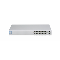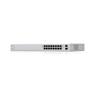 The UniFi� Switch delivers robust performance over its 18 independent switching ports. Two SFP ports offer optical connectivity, and 16 Gigabit Ethernet ports offer 802.3af/at PoE+ or 24V passive PoE sharing a total of 150W PoE.